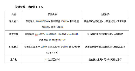 本系统适用于含有爆炸性危险气体和煤尘的矿井中,相当于一个大型不间断电源系统(UPS),在交流工频50Hz、电压AC660V的局部通风系统中。目前大部分矿区掘进工作面、开拓工作面局部通风机均为双风机双电源供电,但仍无法避免因矿并大面积停电等特殊情况造成的风机双停现象,本装置可实现局部通风机大面积停电时的应急自动起动,防止出现瓦斯超限事故,留出人员撤离或处理故障的时间。本系统用于爆炸性危险气体和煤尘的矿井中,采用煤矿铅酸蓄电池防爆特殊型电源装置(型号为DXT336/450)给本系统提供直流电源,风机电控箱通过隔离变压器升压后输出三相AC660V电源,供给第三备用风机。当双电源风机主/备侧同时断电或故障停机后,无法正常往巷道供风的情况下,本系统可以应急启动第三备用风机正常运行。在一定时间内确保并下巷道的空气不间断供给。